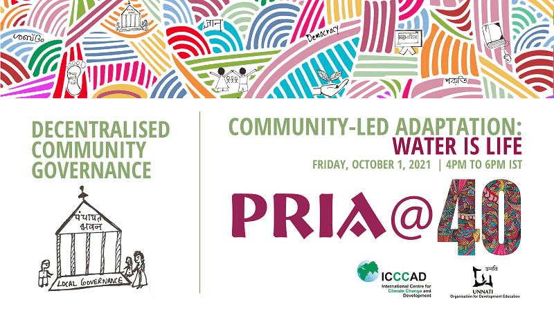 Learning from practices being developed and followed in community-led adaptation to ensure that the ‘source of life: water’ is regenerated for future has become urgent. As part of its PRIA@40 conversations, we are co-convening this dialogue in partnership with ICCCAD, Bangladesh and UNNATI, India on 1st October 2021 between 4 pm and 6 pm. The dialogue is aimed at discussing the following questions: