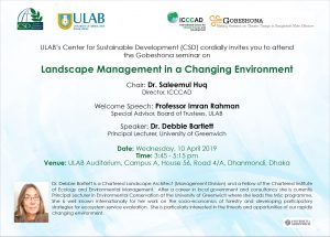 Gobeshona Monthly Seminar Hosted By: ULAB Presentation title: Landscape Management in a Changing Environment Presenter: Dr. Debbie Bertlett, Principal Lecturer, University of Greenwich Chair: Dr. Saleemul Huq, Director, ICCCAD, IUB Seminar Venue ULAB Auditorium, Campus A, House 56, Road 4/A, Dhanmondi, Dhaka 1205 Map of the seminar venue here -------------- Please R.S.V.P. to gobeshona.bd@gmail.com --------------