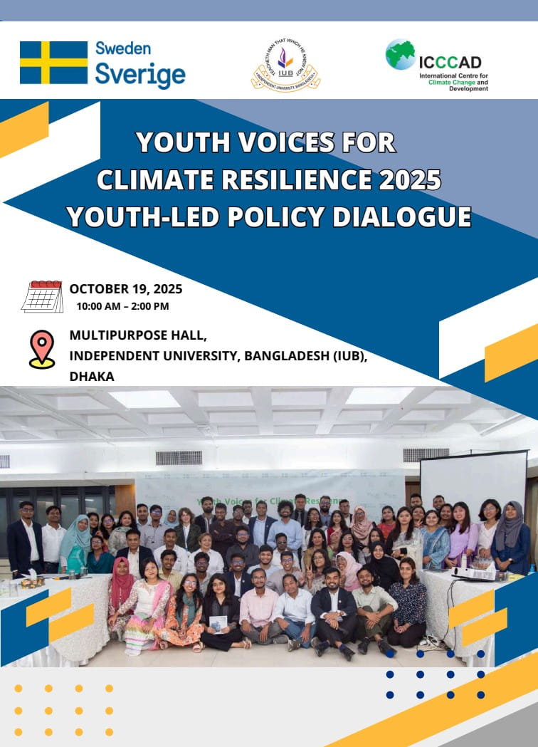 Within this broader effort, a youth-led policy dialogue titled “Youth Voices for Climate Resilience 2025” was organized on 19 October 2025 at IUB Multipurpose Hall, to prepare youth for meaningful participation in COP30 in Belém, Brazil. The dialogue provided a platform to share perspectives on nature-based solutions, climate finance, and just transition while strengthening intergenerational collaboration between youth, policymakers, and development partners.