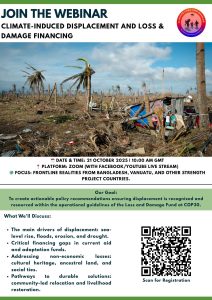 🌍 Join the STRENGTH Insights Webinar Series – Session 2 Climate-Induced Displacement and Loss & Damage Financing 📅 Date & Time: 21 October 2025 | 10:00 AM GMT 📍 Platform: Zoom (with Facebook/YouTube live stream) 🌐 Focus: Frontline realities from Bangladesh, Vanuatu, and other STRENGTH project countries The second webinar of the STRENGTH Insights Series tackles the urgent …