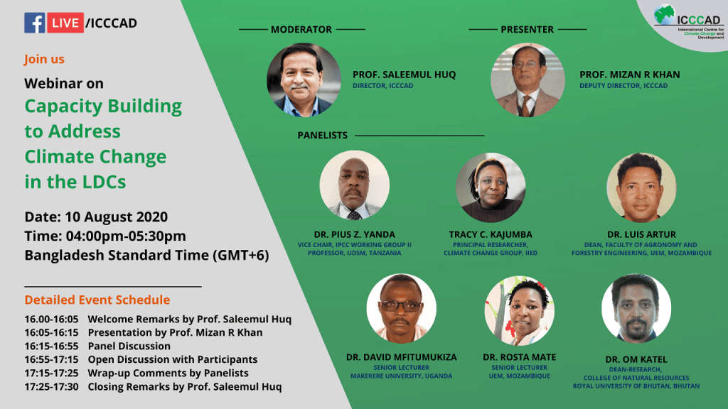 International Centre for Climate Change and Development (ICCCAD) is going to organize Webinar on Capacity Building to Address Climate Change in the LDCs Date : Monday, 10 Aug 2020 Time : 04:00 pm-05:30 pm Bangladesh Standard Time (GMT+6) The importance of capacity building to address climate change cannot be overstated. Globally, about 70% of …