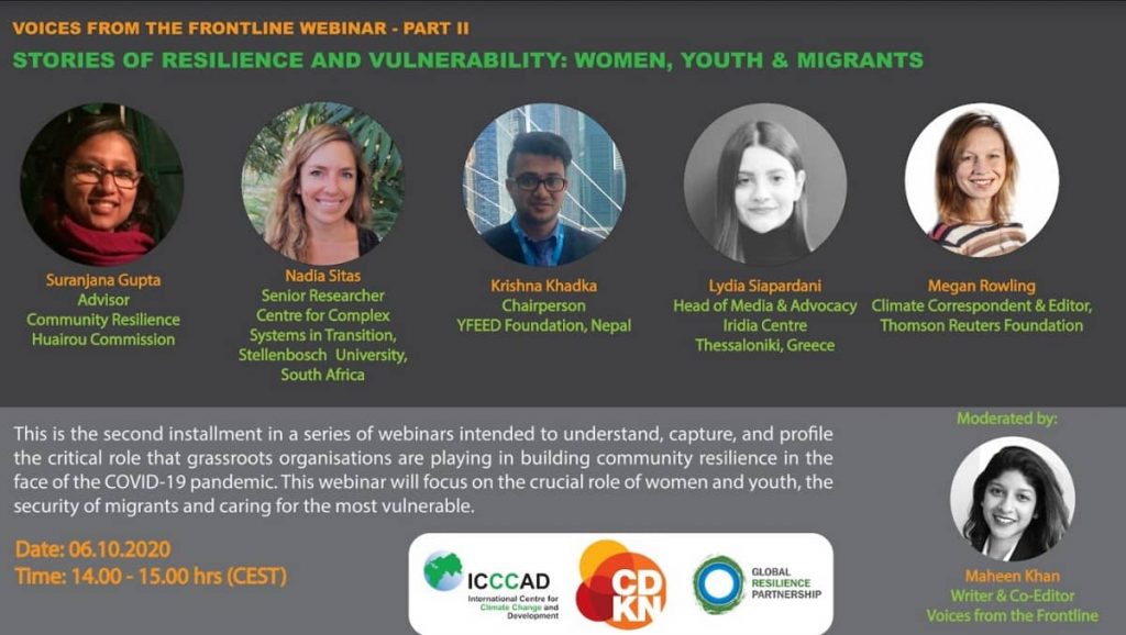 Stories of Resilience and Vulnerability: Women, Youth, and Migrants Date: Tuesday, 06 October 2020 Time: 14.00 - 15.00 (CEST) Join us for the second installment in a series of webinars intended to understand, capture, and profile the critical role that grassroots organisations are playing in building community resilience in the face of the COVID-19 pandemic. This webinar will focus on the crucial role of women and youth, the security of migrants and caring for the most vulnerable. Registration For any further queries, please contact: Shahrin…
