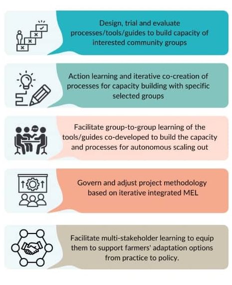 Cross-cutting themes essential to this pathway include iterative monitoring, evaluation, and learning (MEL), a gender strategy, and farmer-led multi-stakeholder networks. The pathway also highlights the role of advisory committees in providing feedback and leadership mentoring. Ultimately, the goal is to achieve systemic change and sustainability, leading to a transformed institutional structure and the accelerated implementation of diverse adaptation options.